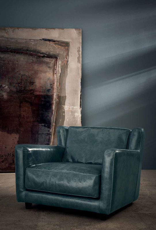 Seat cushions and back cushions in washed and sterilized goose down with pad in differentiated density polyurethane foam. Decorative piping in the same shade of leather.