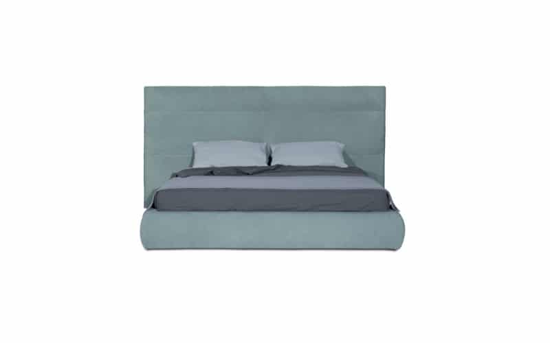 Velvet-covered back of the headboard. Bed frame upholstery in removable leather.