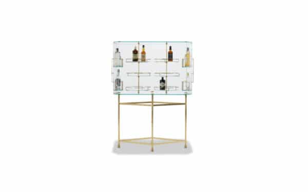 Structure and openable side doors in tempered glass with extra-light colour. Base, hingers and inner accessories for bottles storage in matte-varnished satin-finished brass.
