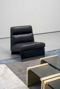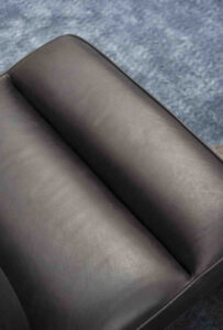Frame in ash veneered wengé-stained beech plywood, shellac finish and borders in satin-finished brass, in hand-finished burnished metal or in satin nickeled metal, with matte varnish. Differentiated density polyurethane foam filling with acrylic fibre covers. Decorative piping in the same shade of leather.