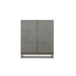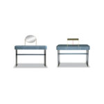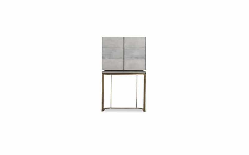 Base in satin brass-coated metal, in hand-finished burnished metal or in satin nickeled metal, with matte varnish. MDF frame with leather upholstery.