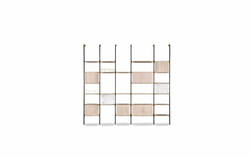 Matte black-varnished supporting aluminium tubular frame, fastened to ceiling or to wall through satin brass pins. Shelves’ supports in satin brass. Shelves with frame in black-stained maple with inside in cane or leather-covered, frame in honey maple with inside in black cane or leather-covered. Storage structure in tempered extra-light glass, 6 mm thickness, or in plywood (honey maple or black-stained maple