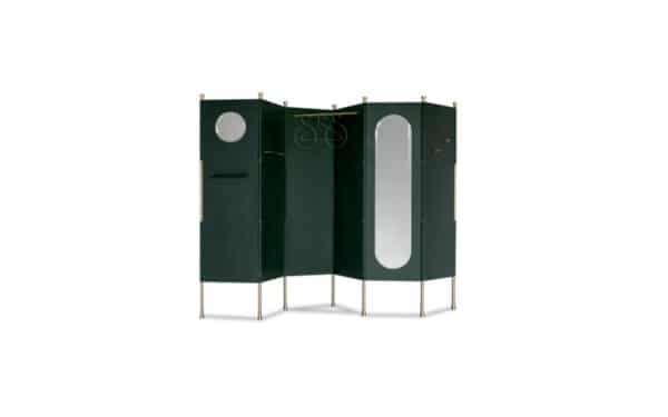 Tubular satin-finished brass frame. Panelling with 4 or 6 modules in birch multi-layered wood, matched with the aluminium leather covered thin layer.