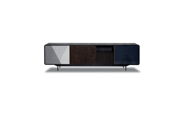 The structure is carried in veneered MDF in black-stained walnut and lacquered in direct brushed polish.