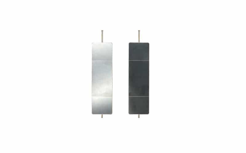 Two-faced screen with revolving structure in antiqued brass, consisting of one side in antiqued mirror and one with leather covering.
