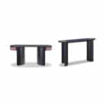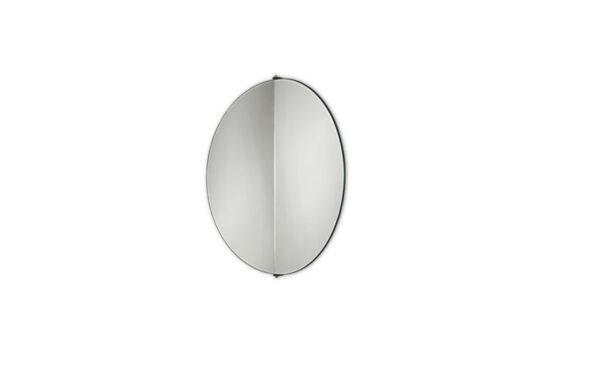 Matte black-varnished metal revolving structure with satin brass details with matte varnish. Rear aluminium metal sheets with leather covering. 12 mm bevelled perimeter mirror.