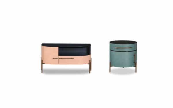 Leather-covered shutter and front drawer. Base, handle and details in hand-finished burnished metal with matte varnish.
