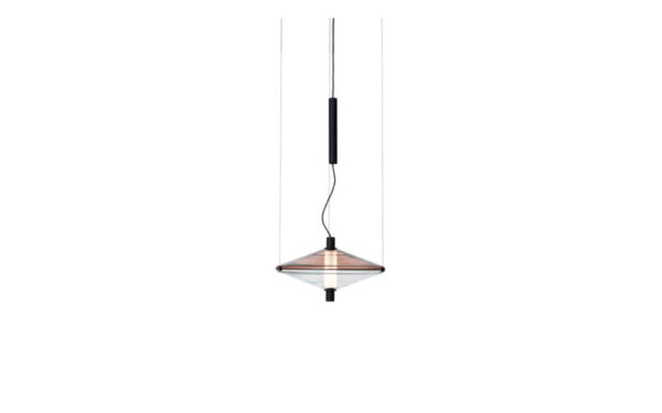 Led hanging lamp with peach-coloured blown crystal in the upper part of the structure and transparent blown crystal in its lower one. Small parts in matte black-varnished aluminium. Inner tube in striped borosilicate glass.