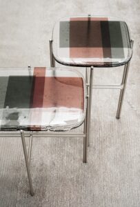Legs in satin brass-coated or in satin nickeled metal, with clear matte varnish.