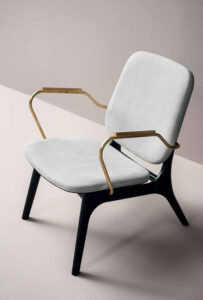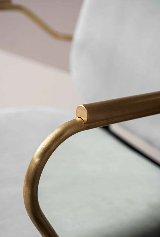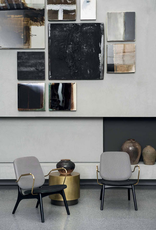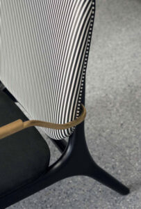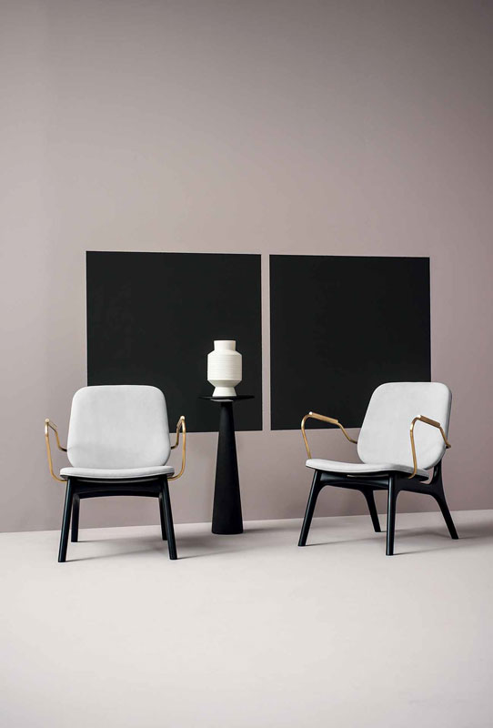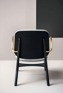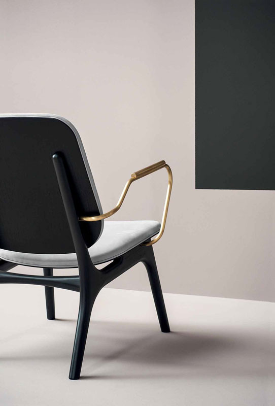 Semi-gloss black-lacquered solid ash frame. Seat and back frame in curved birch plywood, black-stained ash veneered, finished with matte clear enamel. Armrests in satin brass reinforcing rod with matte varnish. Unique density polyurethane foam filling with acrylic fiber cover.