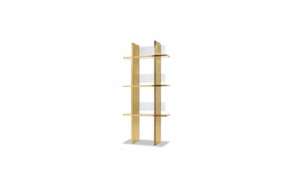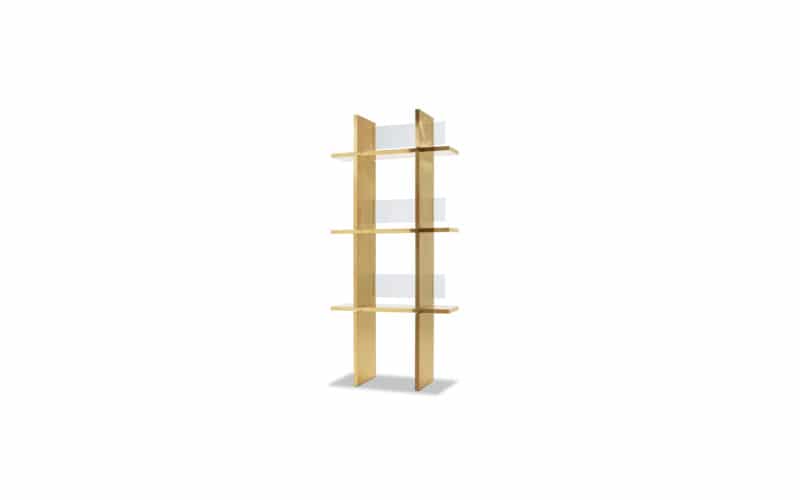 Shelves and side parts with inner aluminium structure covered with plates in brushed polished brass with transparent finish. Back sides in wavy glass with extra-light colour.