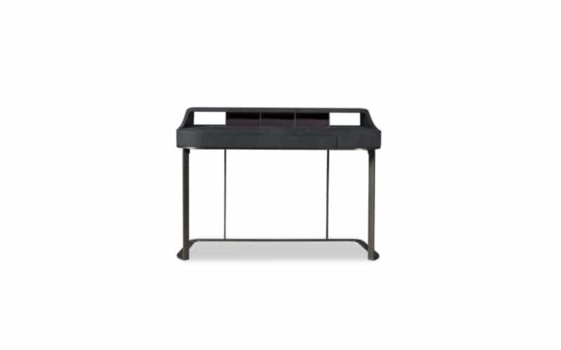 Opening table top with oval mirror. Internal cubby frame in matal sheet covered with leather.