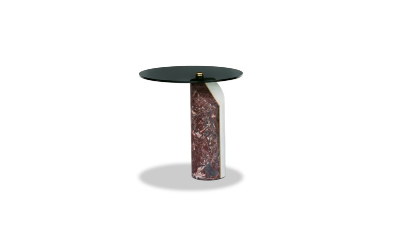 Base composed of two marble blocks, matte Bianco Gioia and matte Rosso Lepanto with water-repellent protective oil, with insert and connection with the top in satin-finished brass with clear matte finish. Revolving top in tempered fumée, paste-dyed glass, 10 mm thickness.