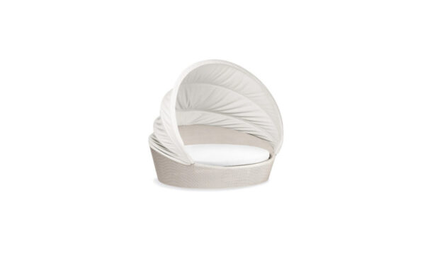 INCLUDING. WHITE CANOPY COLOR : BRONZE SEAT CUSHION IN Nr. 450/cool white DECO CUSHION IN -Nr. (452/cool taupe – 70 x 70 cm- QTY: 4, 450/cool white – 60 x 60 cm- QTY: 4, 450/cool white – 50 x 50 cm- QTY: 2, 452/cool taupe – 40 x 40 cm- QTY: 2)