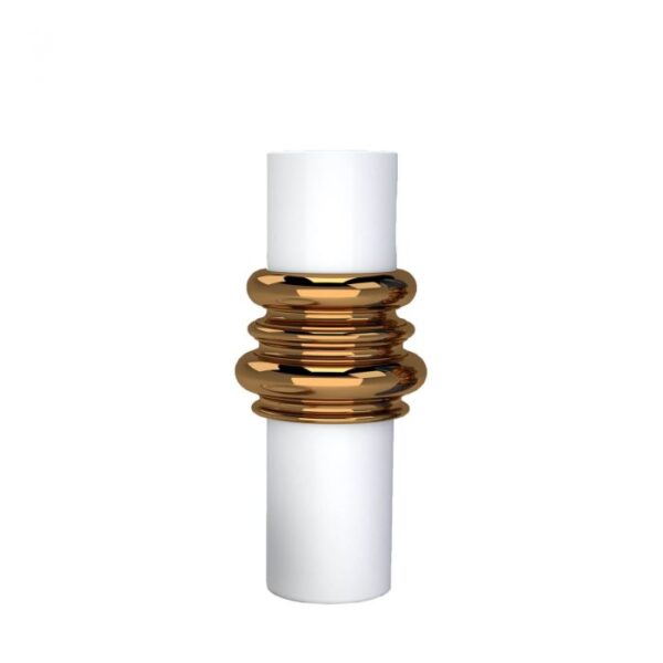 Ordini is a playful and surprising interpretation of classical architectural orders. The workmanship of the vases recalls the mouldings of vitruvian orders in which decorative architectural features become an ornamental element that plays with the cylindrical volume of the vase. The collection includes three elements, namely a broad vase, a narrow vase, and a table centre cup. They feature different decorations with a white and grey chiaroscuro (light-dark) motif or with solid colours (matt white and cobalt blue) enhanced by the warm touch of precious bronze colour mouldings.