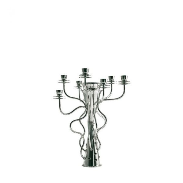 The seven branches of the candleholder by Borek Sipek design are pushing up with sinuous curves, as if they were shoots of a wild plant. When art copies nature.