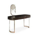 It is a perfect synthesis between figurative lightness and structural weight and it is presented with wooden top, extra clear glass back lacquered, wood and bevelled mirror or covered with leather.