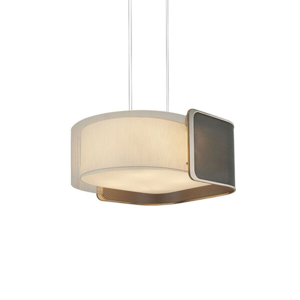 ICON SUSPENSION Steel with gun-metal, Bronze Shadow or Palladium finishing. Curved extraclear glass, decoration with sandblasted vertical stripes. Internal lampshade in silk light colour. Suspension with adjustable steel cables.