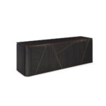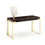 Icon is the sophisticated and minimal lady desk. The lacquered wood structure with brushed polished finish is enhanced by details in polished brass steel, gun-metal grey, Bronze Shadow, polished brass or Palladium and the left side covered externally in leather. The complete set includes an extra-clear glass shelf in the open compartment and is enriched by a bevelled mirror with a steel frame with matching finish.