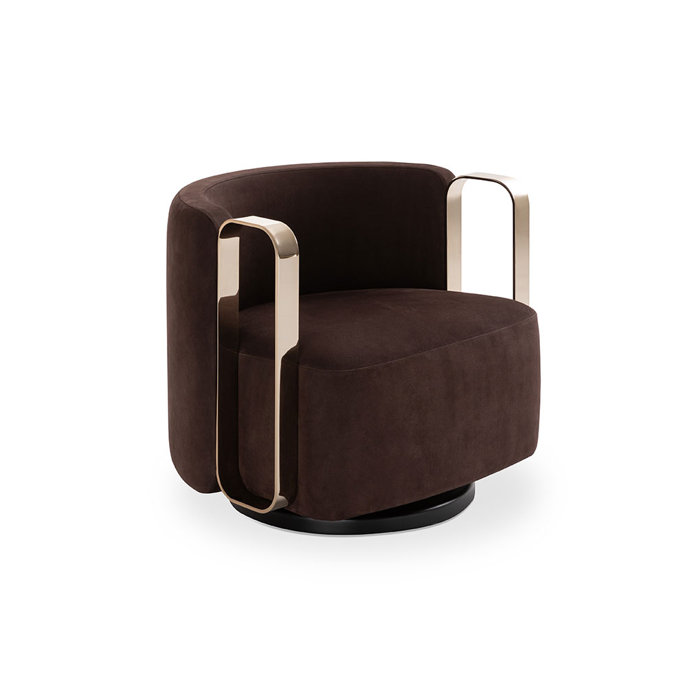 The Kelly armchair features a wraparound structure characterised by independent metal armrests, also available in fabric or leather version, which recalls fashion trends and provides ample stylistic versatility. The contemporary lines of the design are enhanced by the galvanized metal insert between the seat and armrests, a shared detail that serves to link the elements of the new collection. The base is made of wood and houses the exclusive optional swivel mechanism designed for FENDI Casa.