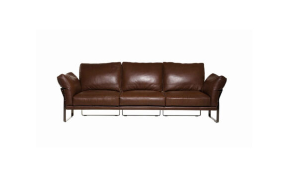 The linear design of the Metropolitan sofa, design Toan Nguyen, is underscored by the steel with gun-metal finishing that holds the luxurious leather cushion.