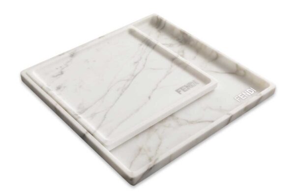 The Ripple trays available in round and square geometric shapes feature a marble surface available in Calacatta Warm Gold, Carrara Gioia, Verde Alpi or the new Portoro Palladium, an Italian stone with intense black nuances enlivened by silver and gold veining. The letters of the FENDI logo are engraved into the marble surface and inlaid with polished steel.