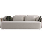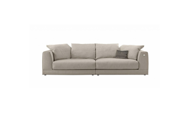 The modernity of the shapes is emphasized by the balanced and harmonic proportions. The frame, with its well-defined traits, features three slim steel profiles in the base running parallel along the entire perimeter. The sofa stands out in terms of the elegant shaped armrest, while soft and rich cushions embrace the large seat.