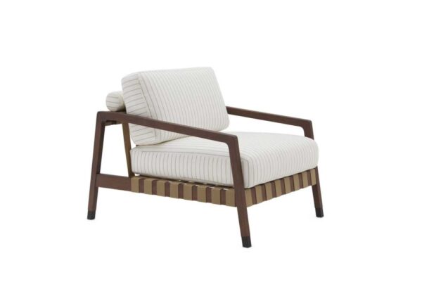 Versilia is the outdoor seating line sporting clean-cut proportions. The solid Iroko wood frame in chestnut tinted semigloss finish houses the soft, waterproof fabric cushioning. A lattice of elastic belts suitable for outdoor use and stainless steel components support the seat and backrest. The decorative roller cushion in co-ordinated fabric completes the seat available in armchair and sofa versions.