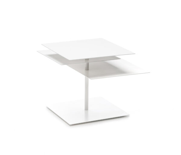B3 completes a little collection based on the idea of architecturally-inspired shapes. B3 features a base stand and three tops positioned horizontally at different heights; the results is a coffee table that hover in the air.