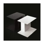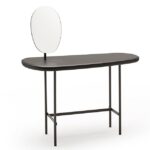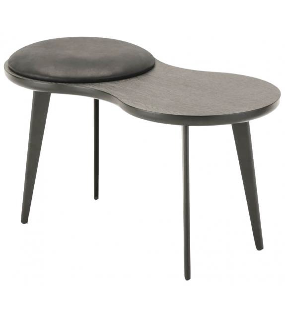 Coffee table/stool which stands out for its fun play of opposites: the horizontal form of the contoured table-top contrasting with the pleasant incline of the tapered legs, and the material aspect of the wood with the smooth, soft surface of the seat which takes shape and becomes three-dimensional.