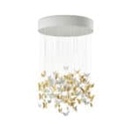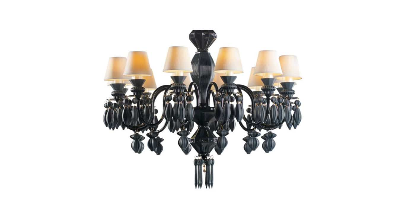Chandelier inspired by plant motifs, interpreted by means of rounded, organic and geometric lines. In the design of the collection, synthetic, feminine, lathed, edgeless shapes predominate in porcelain. The hanging accessories make reference to seeds and bulbs; the bases of lights and other parts of the shaft refer to leaves and flower petals on the point of opening; the lithophanes are inspired by the forms of forest mushrooms.
