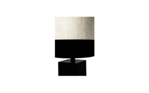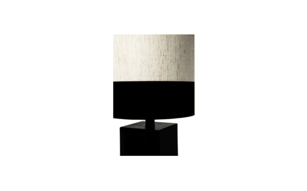 The lampshade is round and made of linen and black velvet.