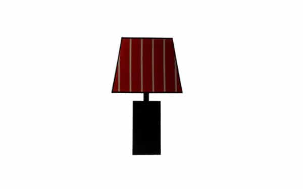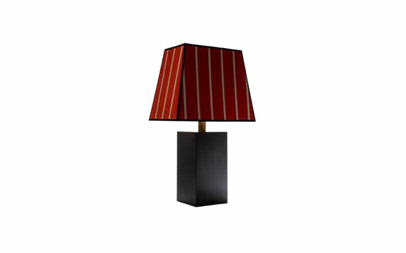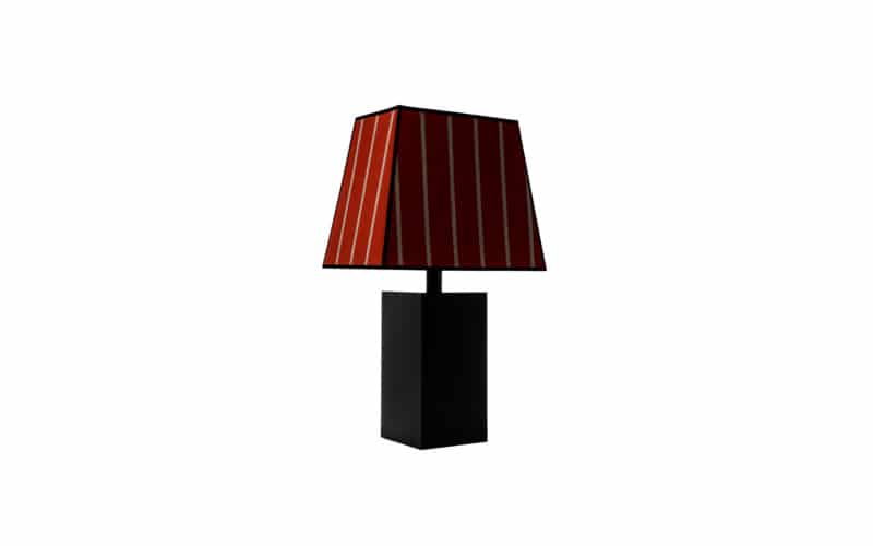 Table lamp, with base made of iron, matte blued black finish. The lampshade is made of Loro Piana Interiors “ATLAS PIMENT DOUX” fabric with black velvet details. E-27 lamp holder, we include led.