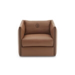 The Larzia armchair is a synonym of softness and cosiness. Shaped like a little round well, it traces the outline of a chair with large forms , with the addition of an enveloping strip that emphasizes the contemporary style. It is introduced with a velvet structure in light colours and nabuk leather details.