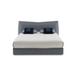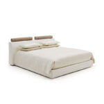 Marris is the bed which completes the namesake lines of chairs, and has all the characteristic stylistic features of the project. Elegant and rational in its geometry, it is defined by a brown leather element worked with maxi vertical lozenges which completely envelops the surface of the large headboard with squared contours. The structure and bed surround are contrasting and are available with light-coloured fabric upholstery.