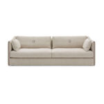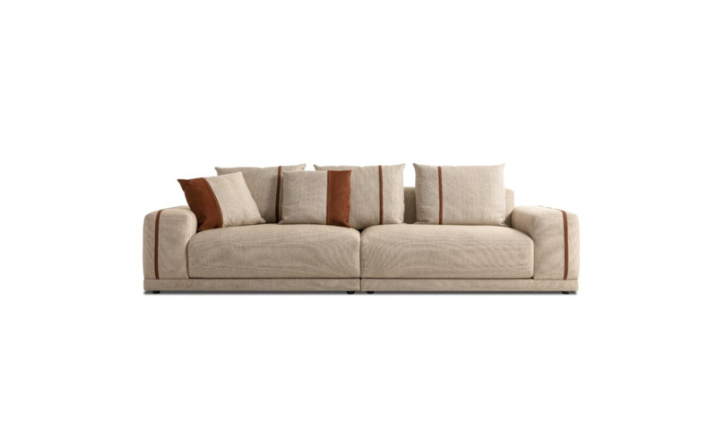 The most contemporary Trussardi Casa product in the collection both for its proportions and alternating fabrics. Essential volumes, defined but not angular shapes. A leather chain stitch detail travels up the armrest dividing the surfaces symmetrically.