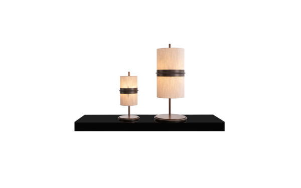 Minimalist in design, the Tiubet collection of lamps is adjustable in height thanks to the telescopic tube. The sand-blasted, bronze finish metal band supports and encircles the lampshade, then reconnects to the structure, lending the lamp a bold ‘’suspended’’ effect. The fabric is natural linen.
